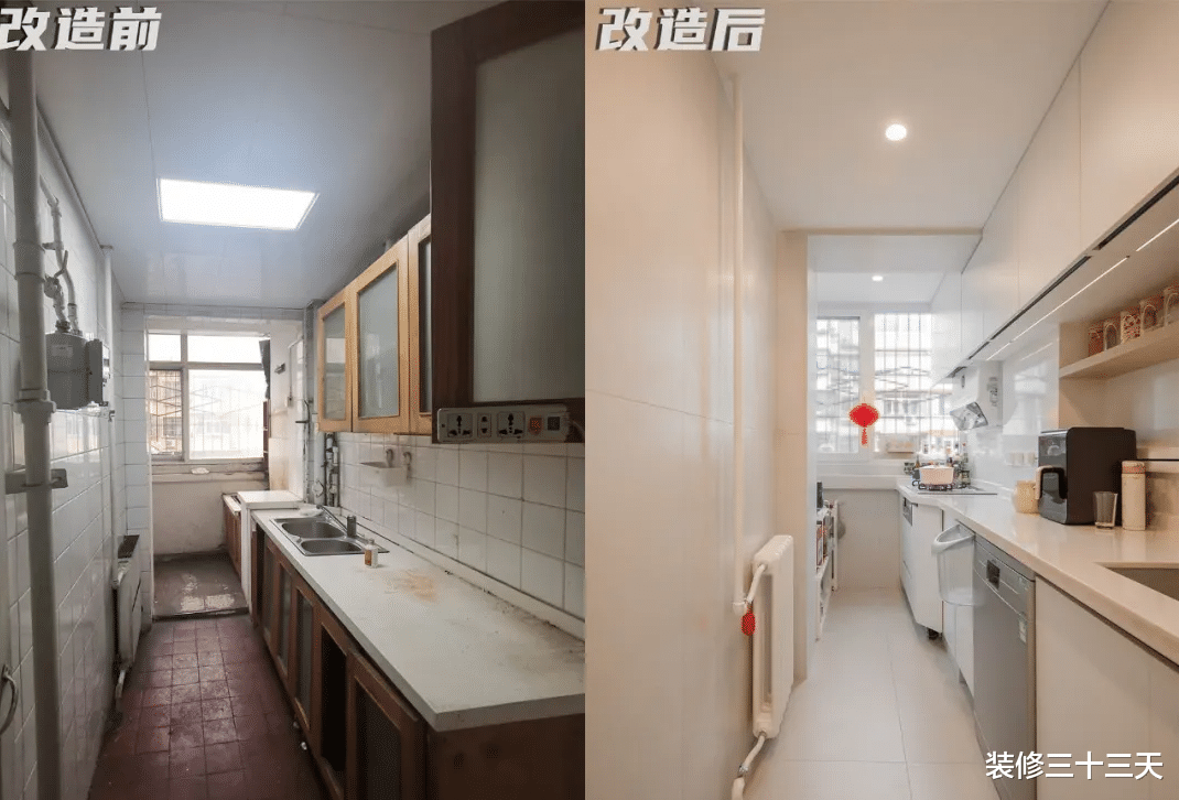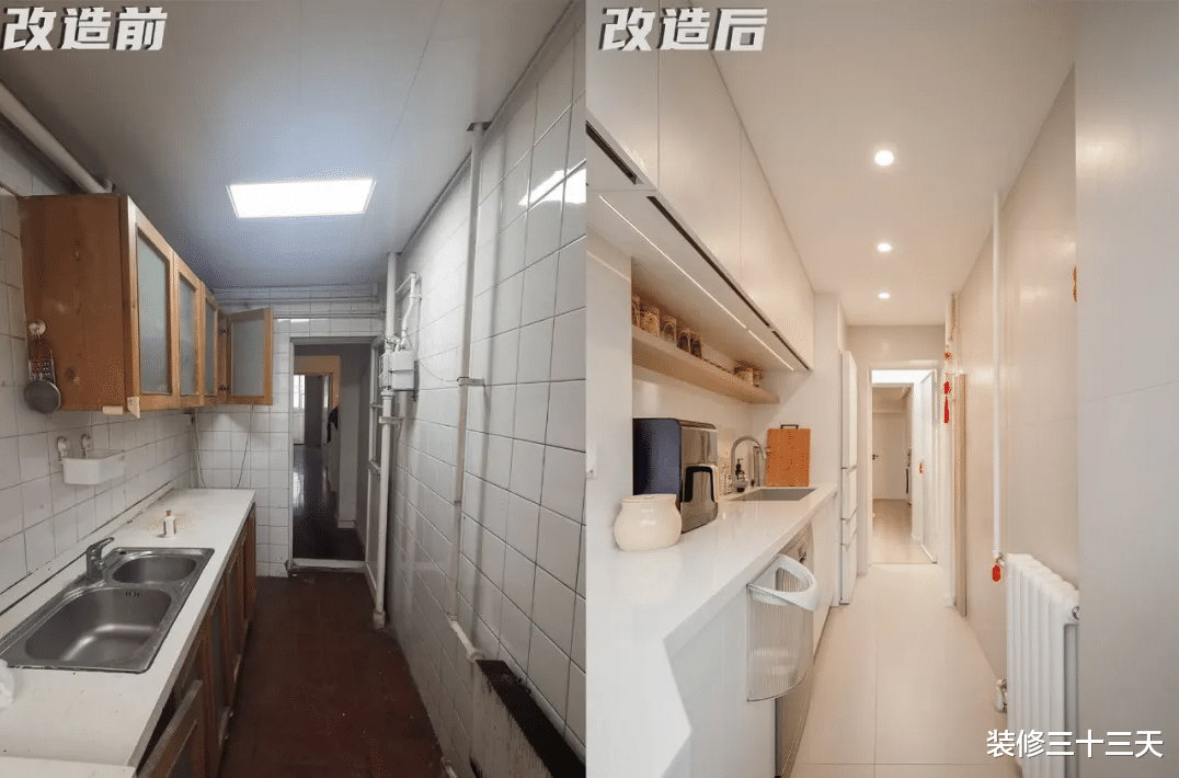▲ 厨房改造前后对比,4.2m长、1.5m宽。改造后取食材→清洗食材→备菜→烹饪,动线流畅。上下柜中就近收纳厨房物品,日常使用更顺手