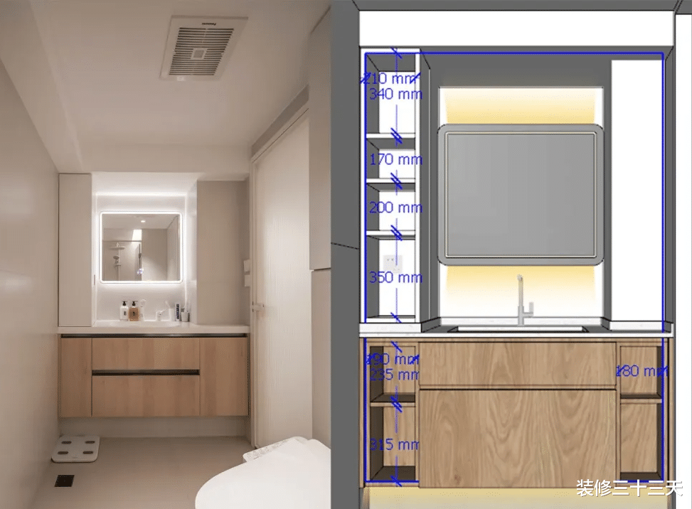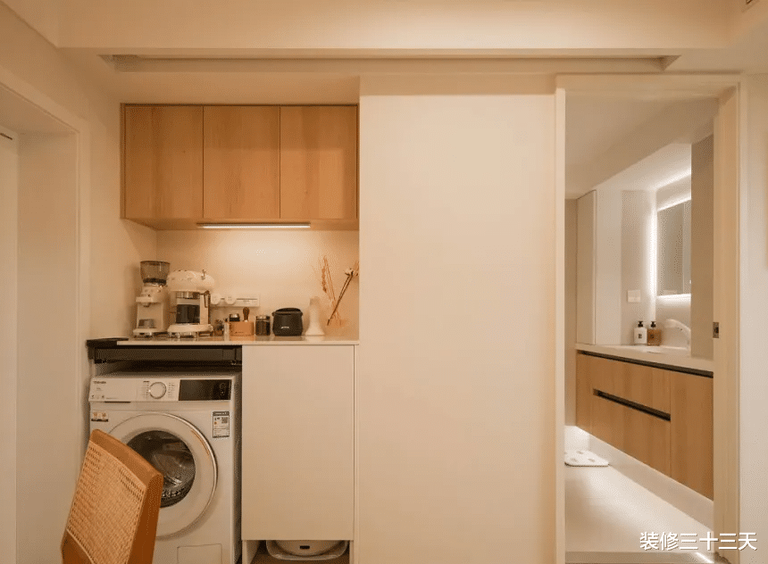 ▲ 改造后,将卫浴间入口换个方向,从而抠出0.7㎡水吧。下柜深600mm,上柜深320mm,日常使用不碰头。下柜嵌入洗衣机,旁边留一截柜门,安放扫拖机器人。顶部预留投影仪槽,放下幕布,可开启观影模式
