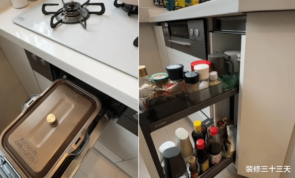 ▲ 三眼灶配有小烤箱,一个人使用刚刚好。一旁留有两层抽拉篮,调味品的瓶瓶罐罐再多都不怕