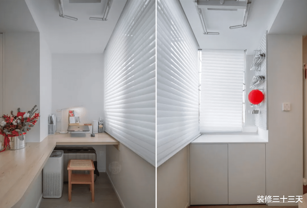 ▲ 阳台两端作为工作学习区与晾衣区,顶部设有自动晾衣架