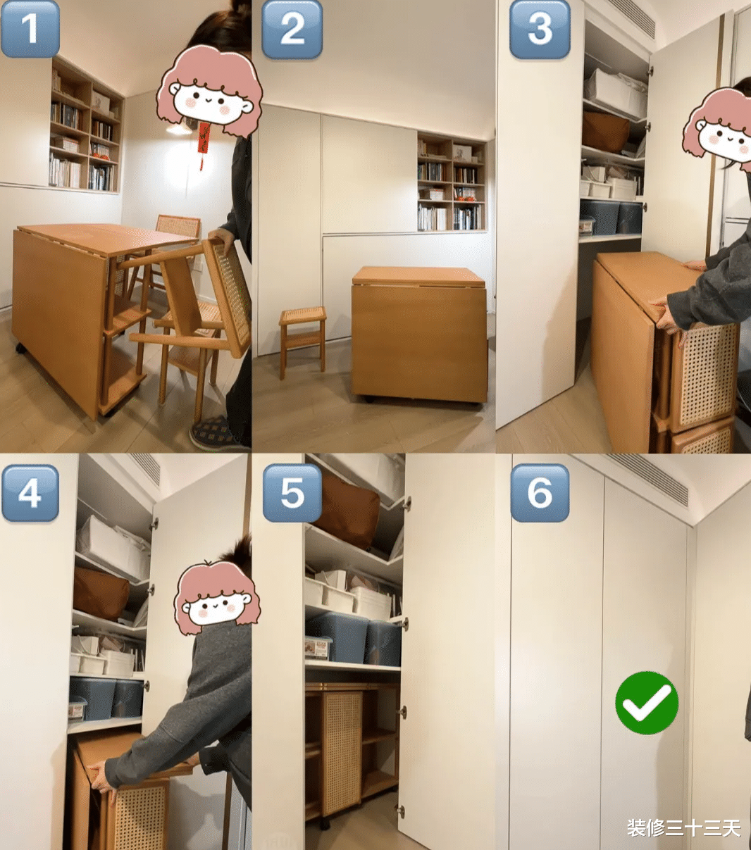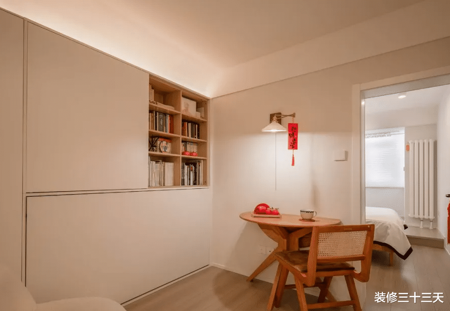 ▲ 小户型的家具,灵活很重要。家人朋友偶尔才来,采用折叠餐桌,餐桌和餐椅合为一体,底部带有滑轮,可以很方便收于柜体中