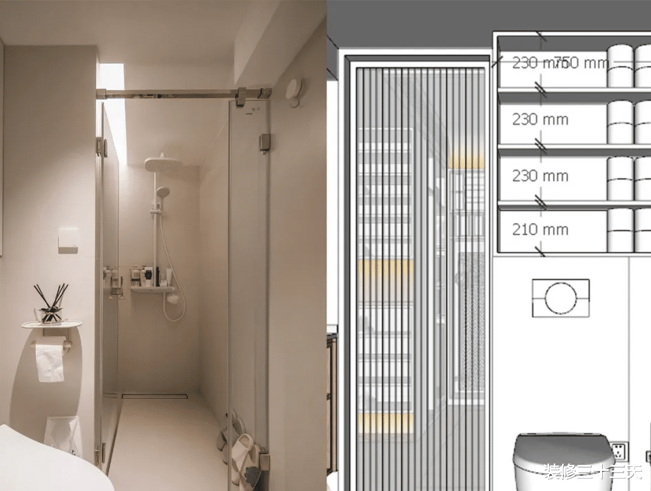 ⑤不到3㎡卫浴间内实现干湿分离,收纳实力在线;
