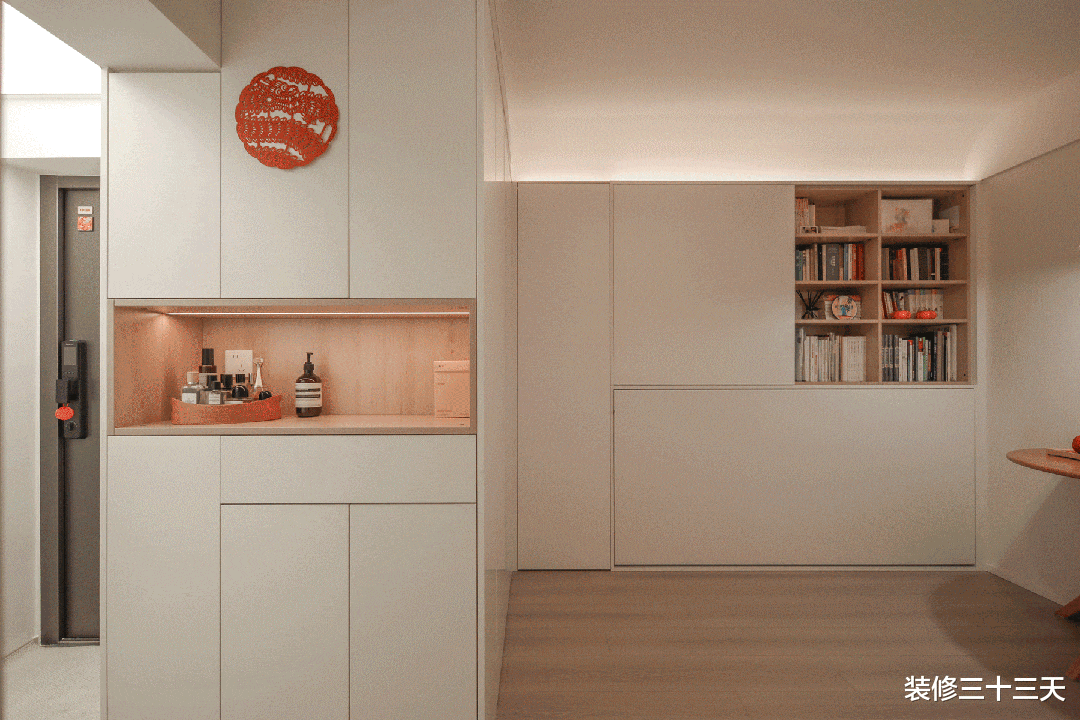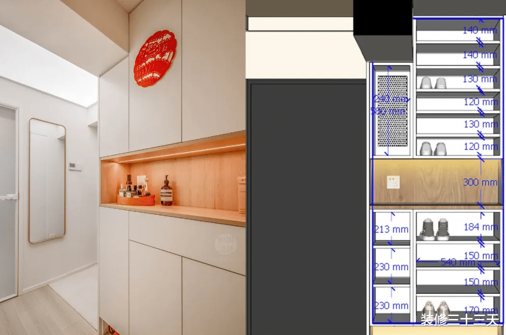 ▲ 改造后,入门顶部设计软膜天花,光线柔和明亮。定制顶天立地玄关柜,柜内藏有洞洞板便于挂放首饰,出入随取随放。上方存放备用或过季鞋子,下方收纳日常外出的鞋子,底部留空放居家鞋,中部随手置物,配合灯光,让回家更有温馨感