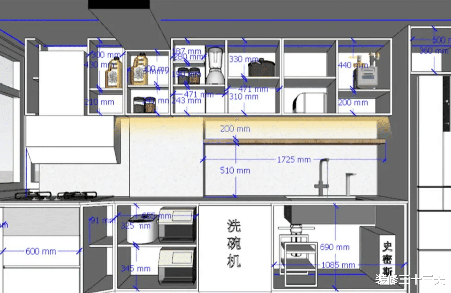▲ 合理布局收纳空间,面积小更要物尽其用,以上是橱柜尺寸图