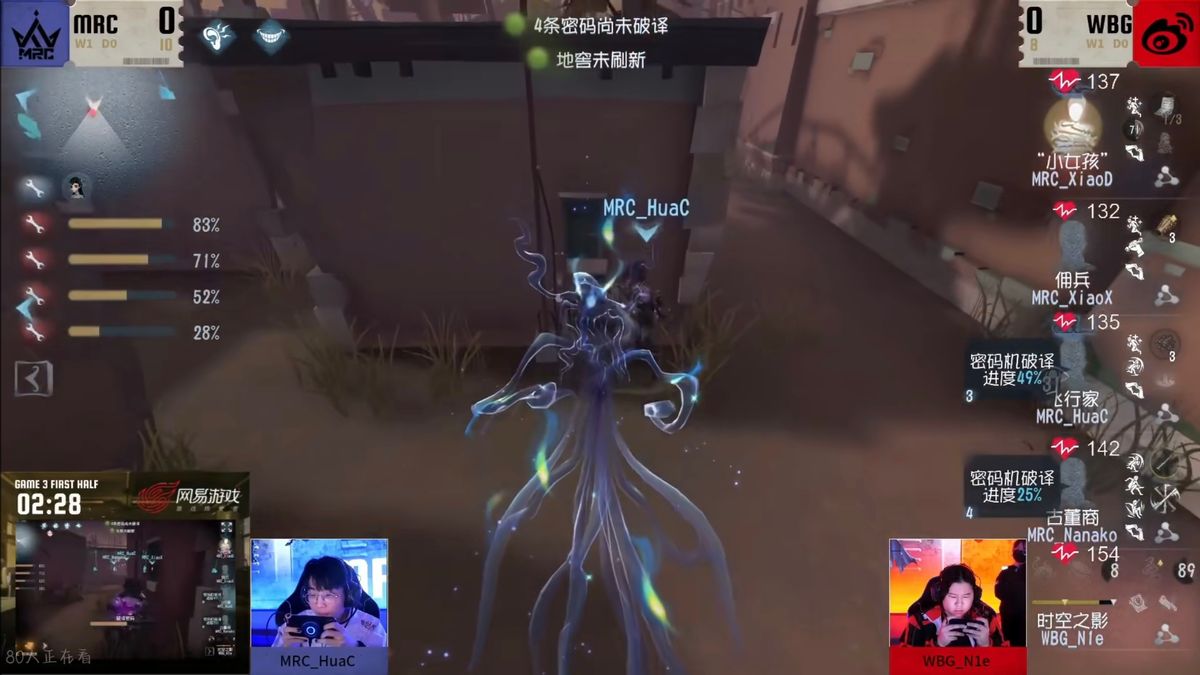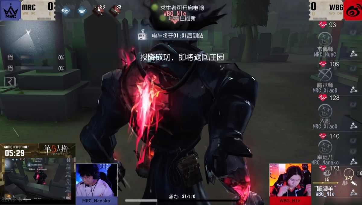 在第一局上半轮的比赛中北京WBG_N1e选出“跛脚羊”,“跛脚羊”快速击倒魔术师并将其送椅,大副和木偶师轮流救下魔术师后,魔术师被淘汰。双方经过几波拉扯,“跛脚羊”先后将大副和木偶师击倒送椅,紧接着求生者将密码机破译完毕。开门战中“跛脚羊”淘汰幸运儿,完成四抓。下半轮的比赛中MRC_BaiLu选出“跛脚羊”,前期“跛脚羊”稳定淘汰弓箭手,中期“跛脚羊”选择追击飞行家,飞行家牵制一段时间后被击倒送椅。随后“跛脚羊”选择传送木偶师,木偶师被击伤后将密码机破译完毕。开门战中“跛脚羊”淘汰木偶师,完成三抓。北京WBG第一局取得优势。
