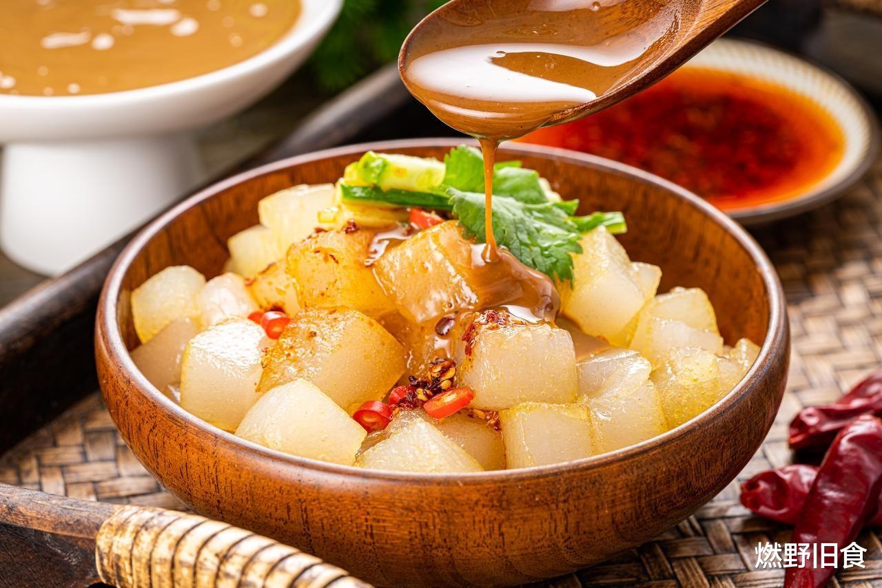 焖子,是用地瓜粉制作而成。将地瓜粉糊放入平底锅,待淀粉结块后晾凉备用。食用时,将焖子切成小块,放入锅中煎至两面金黄,拌上麻酱、蒜水和酱油便是最基础版的焖子了。