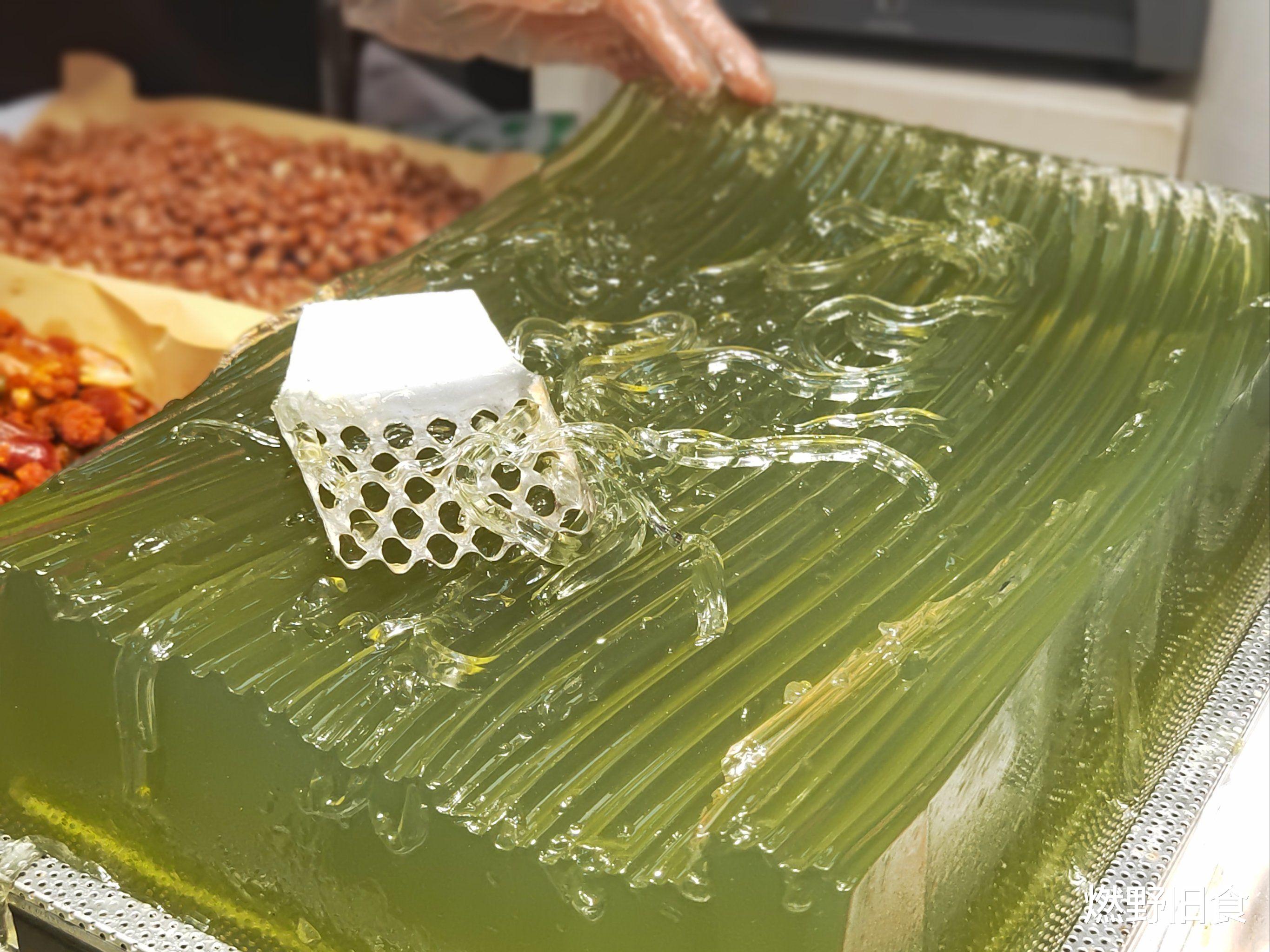将牛毛菜晒干后上锅熬煮7-8小时,经过过滤、晾凉后切成条形,便成了海凉粉。