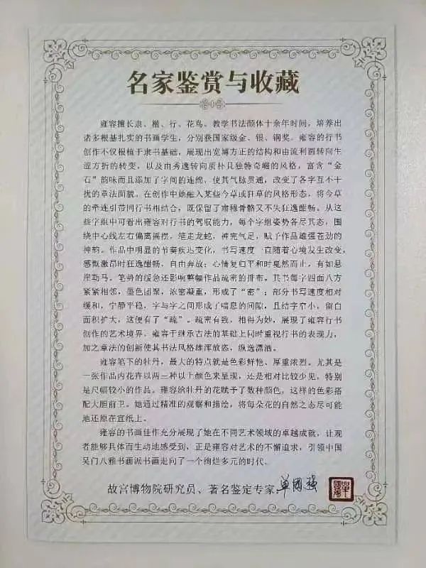 雍容,字雅,号菲比,性别 女,汉族,祖籍四川,1973年9月出生于新疆,中国书画协会会员,中国诗书画家网艺术委员会副主席,中国吴门八雅书画派成员,中国书画传承人物,北京兰亭书画院院士、客座教授,中国国家一级书画师,书法润格每平方尺 100000- 150000 元。檀长 隶、楷、行、花鸟。教学书法颜体十余年时间,培养出诸多根基扎实的书画学生,分别获国家级金银、铜奖。本人自幼酷爱书法美术,1990年毕业于西北师范大学美术系,1992年书法作品在”天马杯”国际书法篆刻大赛获奖,作品被吉林省图书馆收藏,名字载入国际书画家名册。 97年作品在”跨世纪和平杯国际书画大赛 获荣誉奖, 2010 年 纪念毛泽东《沁园春.雪》获 金奖 ,被授于深受人民群众喜爱的红色艺术家称号。 2012年作品在”纪念毛泽东延安讲话发表 70 周年全国大赛获 金奖,被授于扎根群众服务群众的杰出书画家。2014年 第五届“之杯”全国诗书画家 书法作品 获 银奖,2016 年 书法作品入编《光辉历,程时代画卷 全国特邀诗文书画名家精品大典》评为最佳书法奖,2019 年“-带一路”中欧意象 欧州邮票艺术人物, 2019 年第十二届全国书画家”书画名人”杯大赛 佳作奖,同年,书法作品经编委会评审被评为一等奖,入编《新中国成立 70 周年文艺作品全集》 2022年获得“冬奥艺术形象大使”荣誉称号。2022年作品与潘天寿,齐白石等前辈合集于《艺术中国百年典藏》。2024年10月其作品在艺脉传承地铁中展播北京线路:1、2、5、8、10、13等八通线、13号线站台、站厅及车厢等展播。2025年6月其作品在北京大兴国际机场展播。2025年分别入选巅峰艺术鉴藏 2025中国书画收藏投资风向标; 中欧建交50周年书画交流展; 世界艺术巨匠巅峰人物;建军98周年,铸剑为魂一一艺术大展特邀艺术家;第七届伦敦艺术双年展中国区推荐艺术家。2025年 园彩墨韵 全国书画名家圆明圆采风活动精品展,(故宫博物院研究员、书画鉴定界泰斗单国强,单老观看了我的原作,给予了很高评价,并与原作品合影。)2024年年底 中国故宫博物院研究员 著名签定专家 单国强老先生 对其作品做亲自的评价。