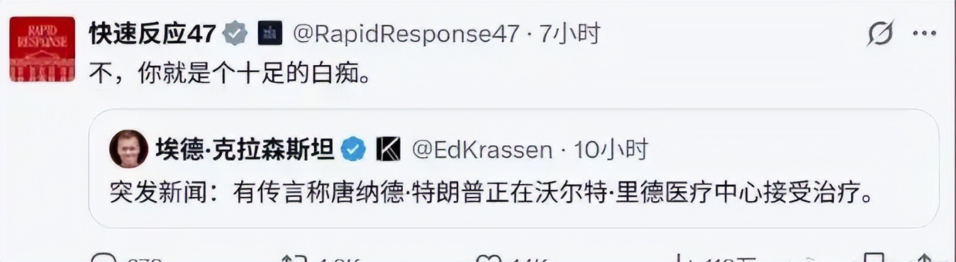 白宫官方账号 “快速反应 47” 也直接出击,指出特朗普只是连续 12 小时没有接受媒体采访,就被 “精神错乱的自由派” 编造荒谬的阴谋论,还反问为何拜登经常连续 12 天不接受采访,却没人质疑。