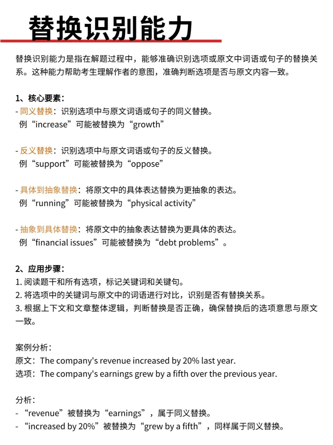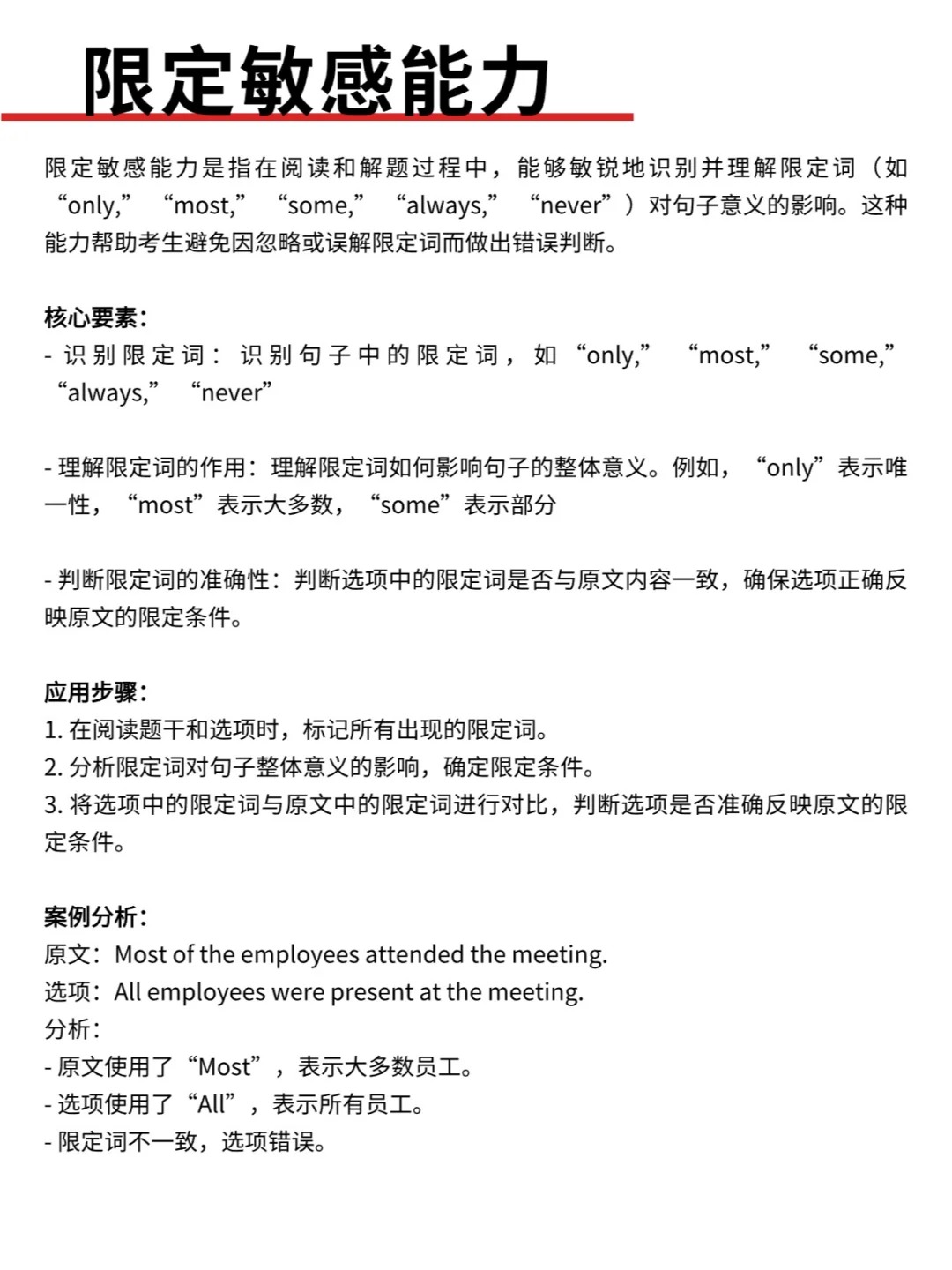 🧰替换识别能力是指在解题过程中,能够准确识别选项或原文中词语或句子的替换关系。这种能力帮助考生理解作者的意图,准确判断选项是否与原文内容一致。1、核心要素:- 同义替换:识别选项中与原文词语或句子的同义替换。- 反义替换:识别选项中与原文词语或句子的反义替换。- 具体到抽象替换:将原文中的具体表达替换为更抽象的表达。- 抽象到具体替换:将原文中的抽象表达替换为更具体的表达。2、应用步骤:(1)阅读题干和所有选项,标记关键词和关键句。(2)将选项中的关键词与原文中的词语进行对比,识别是否有替换关系。(3)根据上下文和文章整体逻辑,判断替换是否正确,确保替换后的选项意思与原文一致。🧰限定敏感能力是指在阅读和解题过程中,能够敏锐地识别并理解限定词(如“only,” “most,” “some,” “always,” “never”)对句子意义的影响。这种能力帮助考生避免因忽略或误解限定词而做出错误判断。1、核心要素:- 识别限定词:识别句子中的限定词,如“only,” “most,” “some,” “always,” “never”。- 理解限定词的作用:理解限定词如何影响句子的整体意义。例如,“only”表示唯一性,“most”表示大多数,“some”表示部分。- 判断限定词的准确性:判断选项中的限定词是否与原文内容一致,确保选项正确反映原文的限定条件。2、应用步骤:(1)在阅读题干和选项时,标记所有出现的限定词。(2) 分析限定词对句子整体意义的影响,确定限定条件。(3)将选项中的限定词与原文中的限定词进行对比,判断选项是否准确反映原文的限定条件。