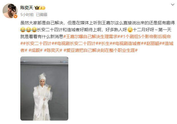 陈奕天发文“虽然大家都是自己解决,但是在媒体上听到王嘉尔这么直接说出来的还是挺有趣得长安二十四计和造城者好期待上啊,好多熟人呀!十二月好呀~第一天就是看看有什么新消息#王嘉尔曝自己解决生理需求##1个剧组5个影帝影后视帝##长安二十四计##电视剧长安二十四计##长生##电视剧造城者##赵丽颖##造城者# #成毅# #陈奕天# #爱豆请把自己解决刻在整个职业生涯#‍”