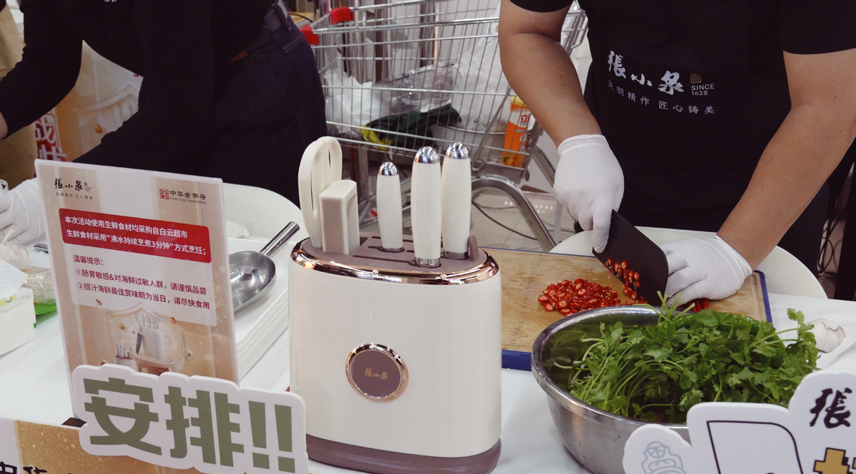 “张师傅请你吃捞汁海鲜桶”活动是现场另一亮点。工作人员使用张小泉“鎏光”“曲直”系列抗菌套刀切配生鲜食材,并用品牌锅具进行烹制。向居民们传达厨房处理食材,可以生熟分切、专刀专用,并且通过使用抗菌刀具可以避免细菌交叉感染,特别是生鲜食材;活动当天派发了约50份海鲜桶,不少居民现场表现出对“鎏光”抗菌套刀的兴趣,并咨询新品购买渠道。简单的一次社区体验,让“刀具”这一生活工具成为连接居民与品牌的媒介。