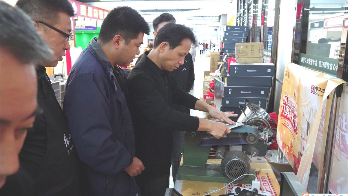 10月17日至19日,滁州站活动在当地商超举行。张小泉匠师团队连续三天提供免费刀具修磨服务,吸引了众多居民前来咨询。活动现场,老匠师耐心打磨刀具,讲解刀具使用与保养技巧;两位新加入的修磨队成员在旁协助、学习,形成了老带新的传承场面。