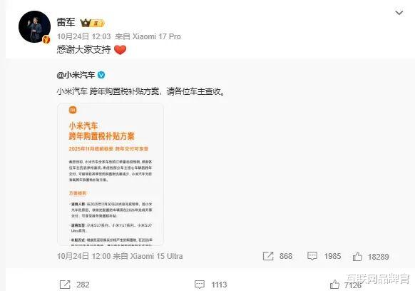 值得注意的是,冬测热度未消,小米10月24日抛出的购置税补贴方案:2025年11月30日前锁单用户,若车辆延期至2026年交付,可享受最高1.5万元的跨年购置税差额补贴,覆盖SU7、YU7全系车型,预计总投入超20亿元。