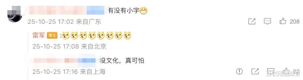 搞笑的是,“有没有小字?”面对网友的灵魂拷问,雷军在庆功微博下甩出8个狗头表情,用幽默回避了直接解释。