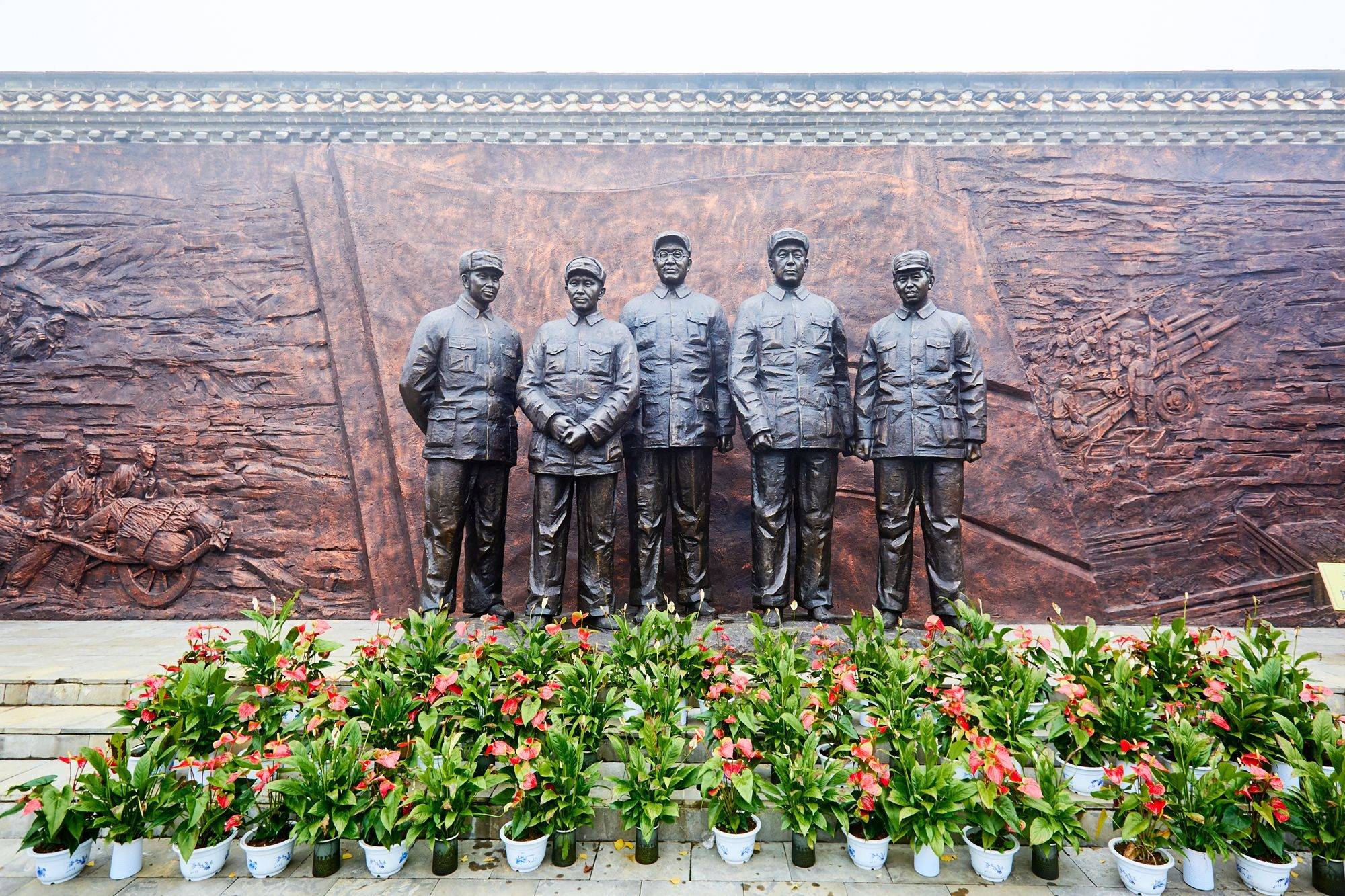 绿植鲜花掩映着总前委成员群像雕塑,刘伯承、陈毅、邓小平、粟裕、谭震林五位首长目光坚定地望向远方,仿佛看到了新中国的曙光。身后浮雕再现了百万雄师过大江等淮海战役的壮阔场面,令人心潮澎湃。