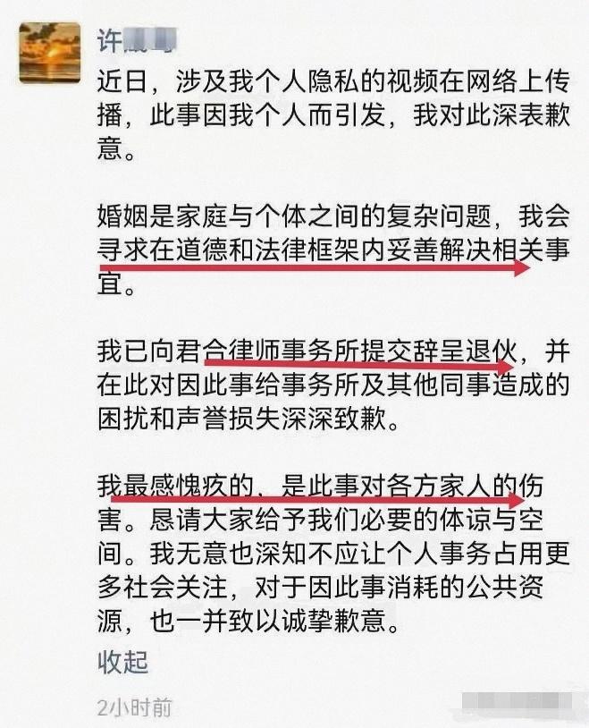 公开道歉与辞职决定11月3日,网络上开始流传一份疑似许某发布在朋友圈的道歉声明。在这份声明中,许某承认事件因自己的个人行为引发,并对此表示歉意。他明确表示“已向律所提交辞呈退伙”,证实了辞职传闻。