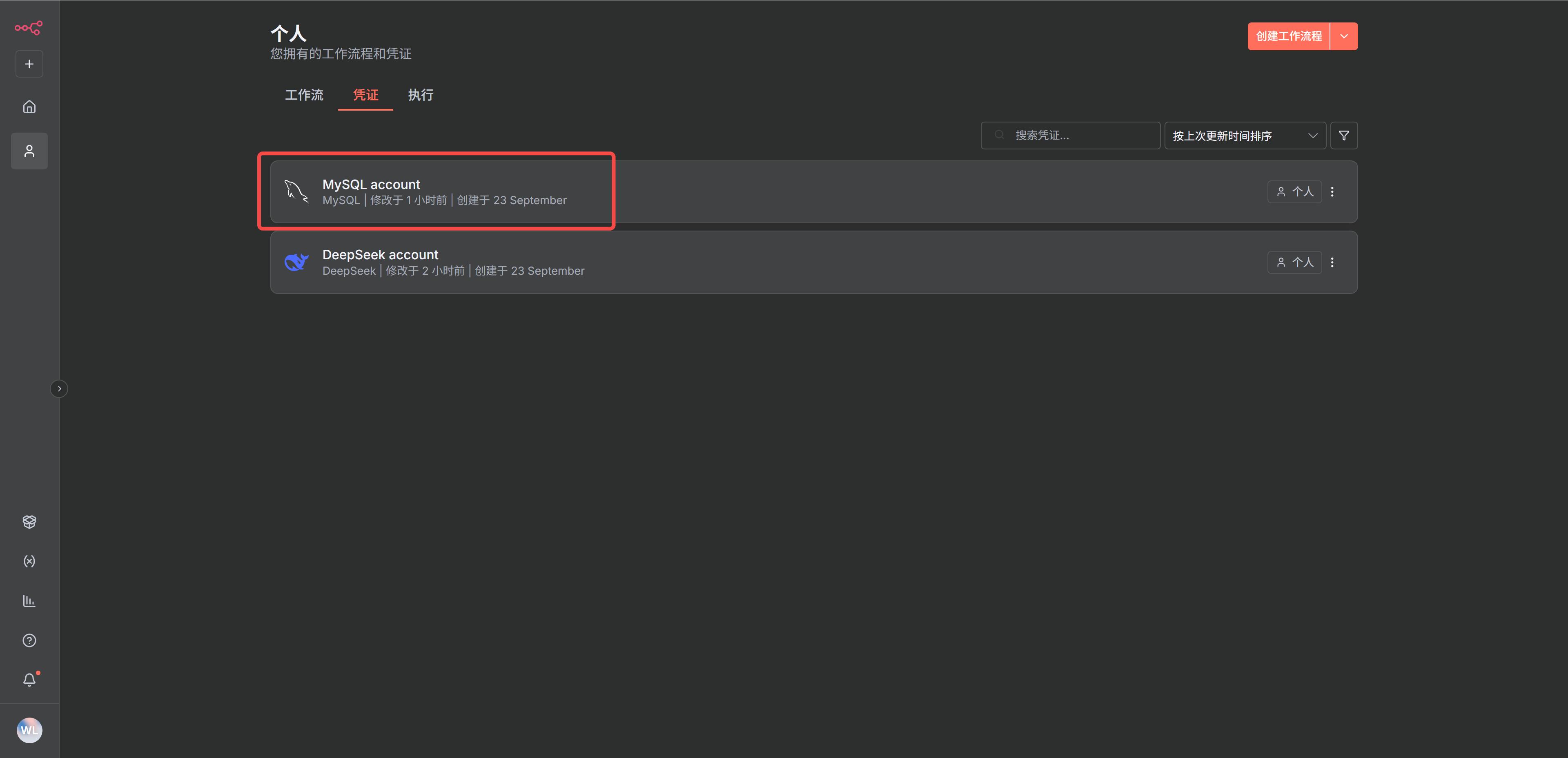 而使用 n8n 直接用内置的 MySQL 插件就可以使用了,并且配置的 MySQL 连接凭证,后续可以重复使用(不用每次都配置)。