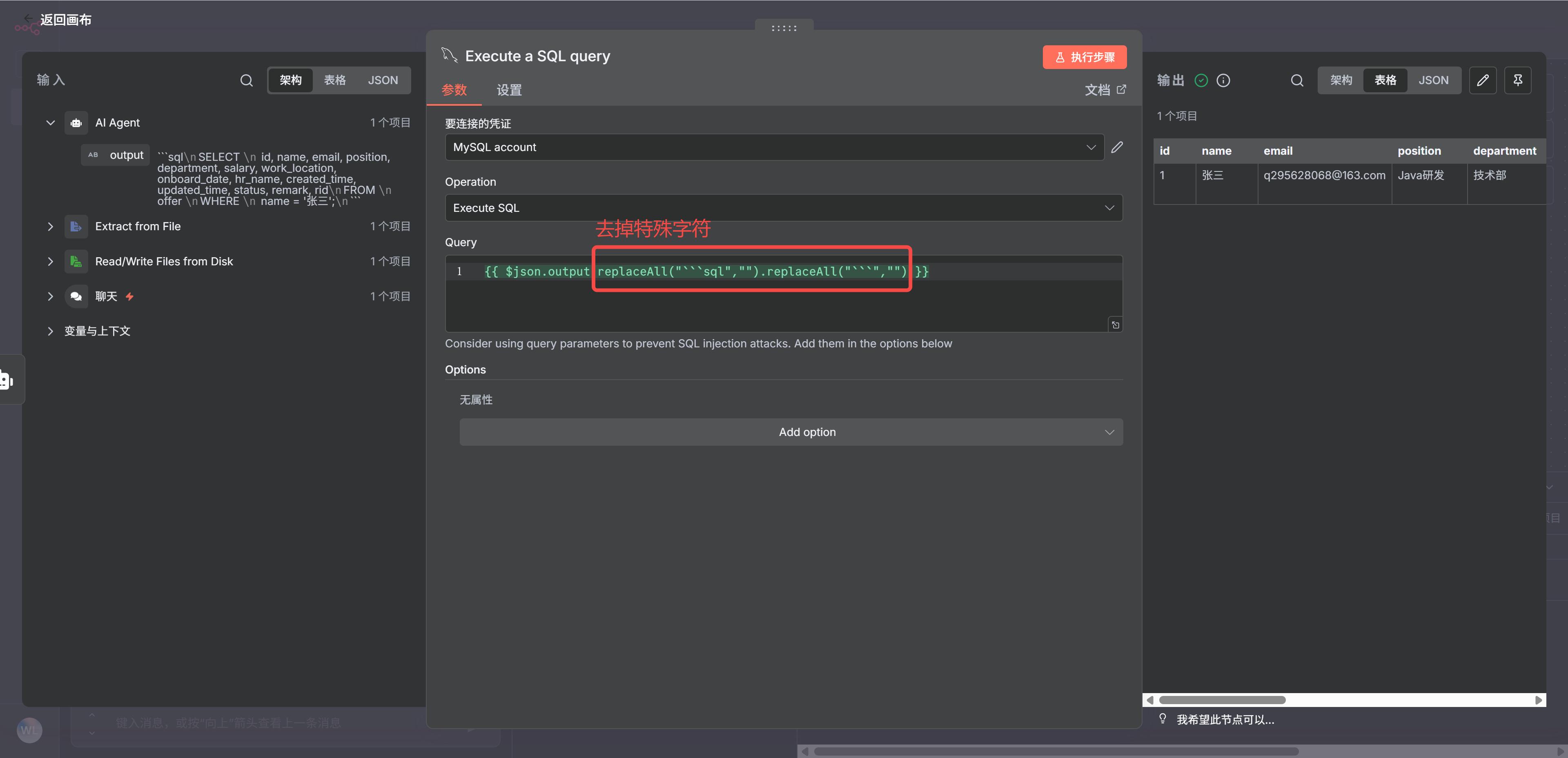 尽管我们这样写提示词,但 n8n 生成的结果依然会有特殊字符,此时 AI Agent 生成的结果我们可以使用正则表达式处理之后,再让 MySQL 组件进行执行才行,如下图所示: