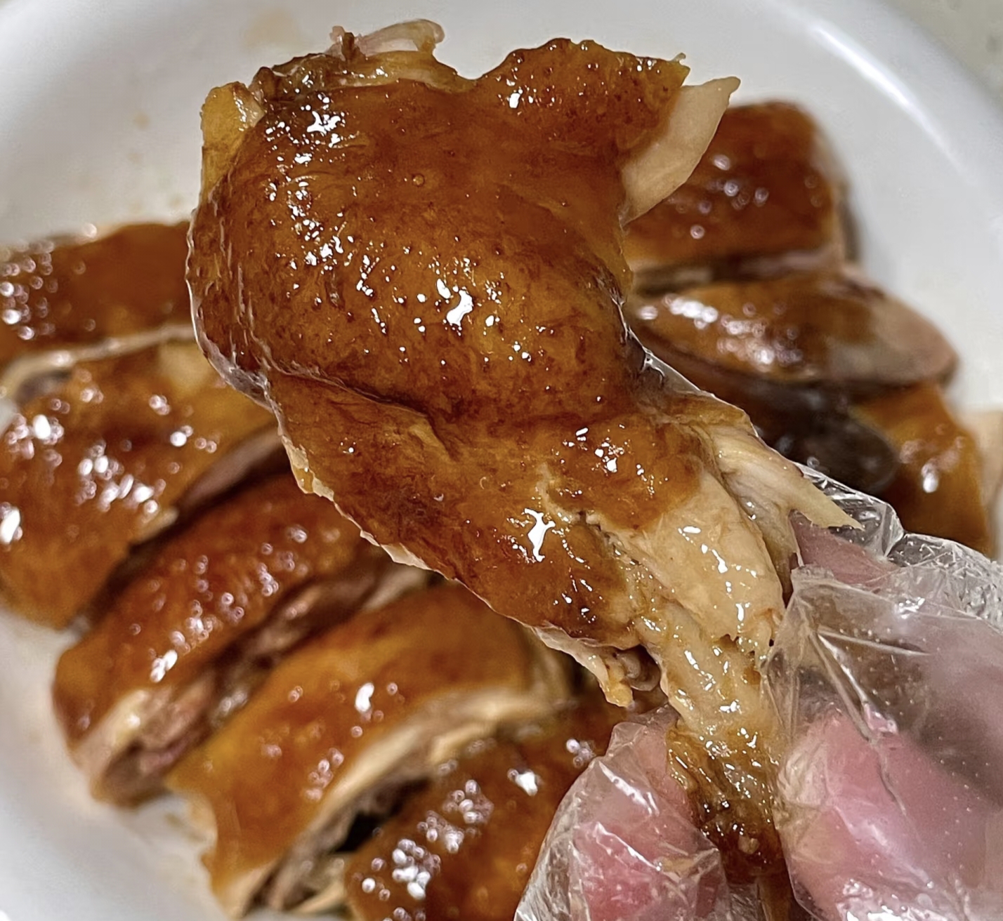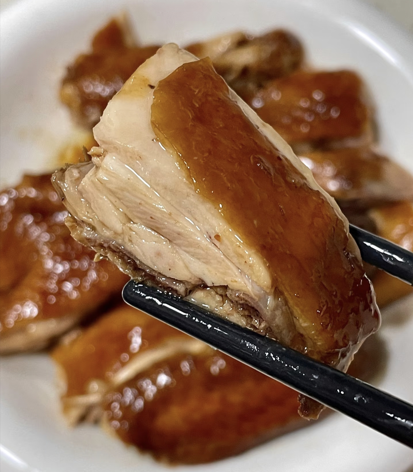 "叮"当微波炉的提示音响起,我迫不及待掀开保鲜膜,琥珀色的鸡皮泛着油亮的光泽,酱香混着葱姜的辛香扑鼻而来。老公举着筷子在