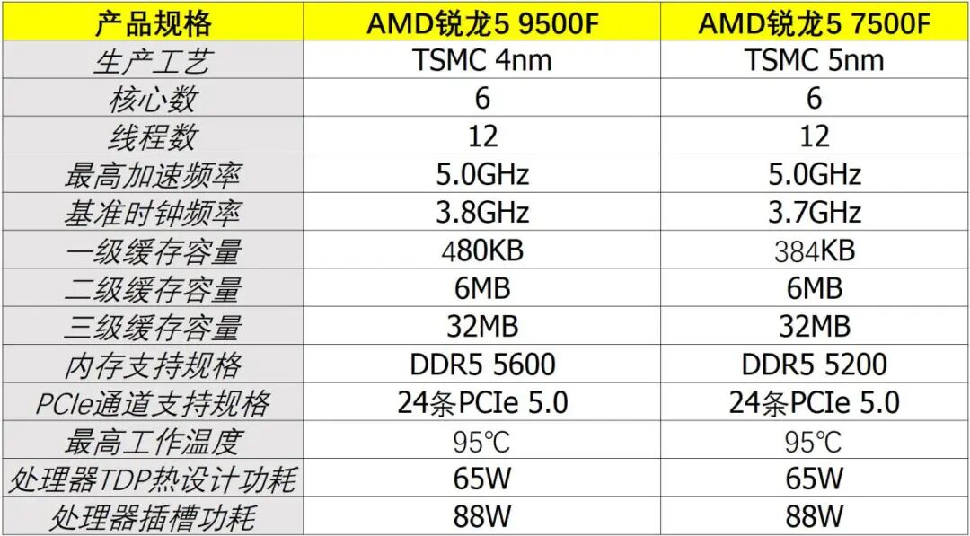 工作频率方面,尽管锐龙5 9500F与锐龙5 7500F的最高加速频率同为5.0GHz,但锐龙5 9500F的基准时钟频率比锐龙5 7500F高了100MHz,为3.8GHz。同时锐龙5 9500F的TDP热设计功耗很低,只有65W,其最高标称插槽功耗也只有88W。扩展能力上,与其他Zen 5处理器相比,锐龙5 9500F并没有精简,而是保持一致,支持DDR5高速率内存,标称内存支持速率为DDR5 5600,锐龙5 7500F的标称内存支持速率为DDR5 5200。当然在实际应用中,AMD Zen 4、Zen 5锐龙处理器可支持的内存速率更高,一般可达DDR5 6000,标称内存支持速率更高可能说明锐龙5 9500F的内存控制器体质优秀,内存超频能力更强。