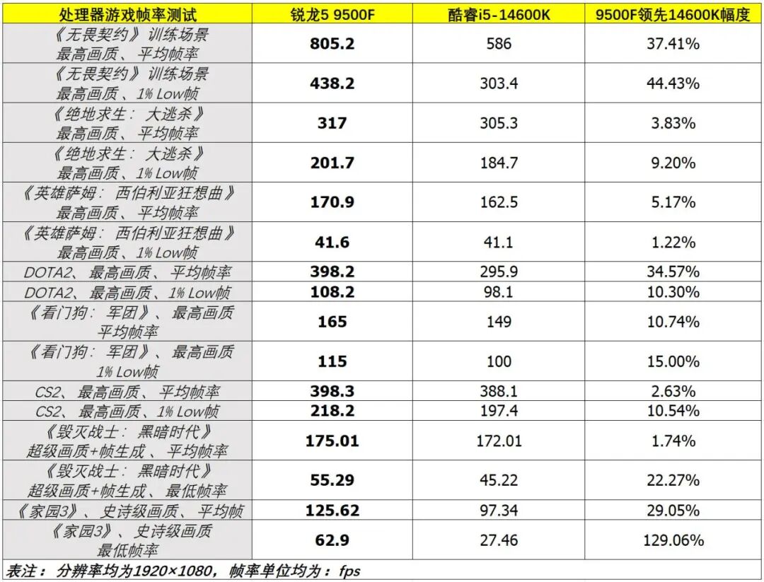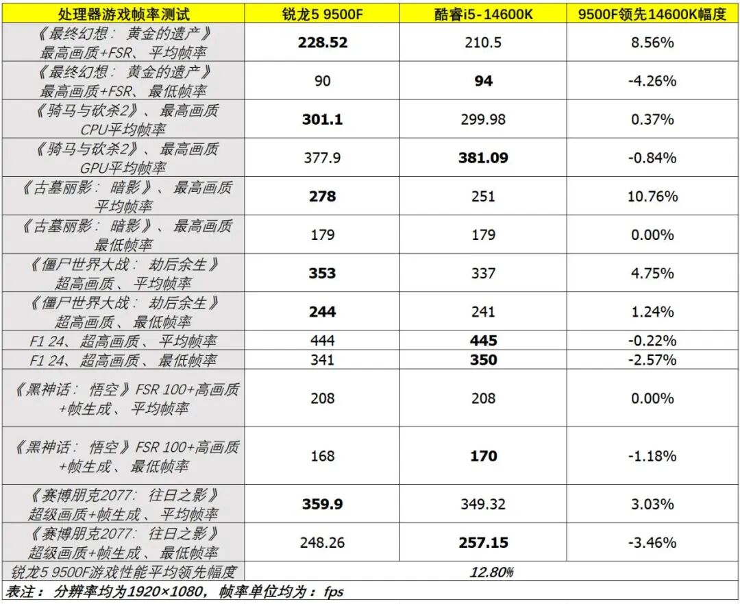 综合以上介绍,可以看到锐龙5 9500F、酷睿i5-14600K在技术规格上互有优势,那么最终在玩家关注的游戏性能上,谁的表现更好呢?