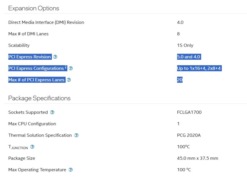 ▲英特尔官方规格显示,酷睿i5-14600K的20条PCIe通道中,只有16条是5.0标准。