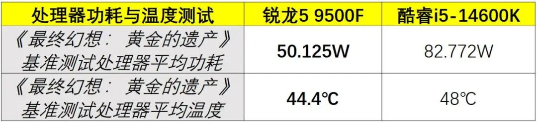 为了解两款处理器在游戏时的功耗与温度表现,我们则采用耗时较长的《最终幻想:黄金的遗产》基准测试进行验证。由于运行游戏时,不会调用所有处理器计算线程,处理器的占用率一般不会超过50%,甚至更低,所以酷睿i5-14600K在该测试中的功耗、温度数值并不惊人,其87.772W的平均功耗低于标称的125W基础功耗,平均温度为48℃。不过锐龙5 9500F的表现则更好,它在运行该测试时的平均功耗只有50.125W,酷睿i5-14600K的功耗比锐龙5 9500F高了65.1%。同时锐龙5 9500F的平均温度只有44.4℃,也要更低一些。因此从功耗与温度的角度来看,锐龙5 9500F更适合长时间游戏的玩家。