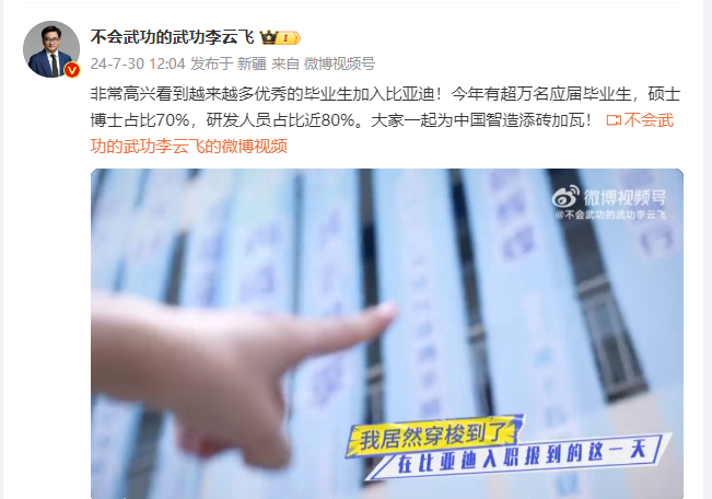 云巴,现代化园区,限量款工牌,真的有点羡慕新入职比亚迪的员工了!更没想到的是比亚迪这么重视人才,硕士博士占比70%,研发