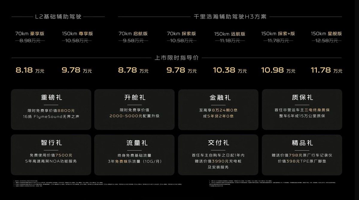 智能座舱搭载Flyme Auto系统,支持高德810车道级导航、红绿灯状态实时显示,16扬声器音响含头枕单元,提供7.1声道音效。标配L2级辅助驾驶,涵盖全速自适应巡航、自动泊车等功能,车机兼容华为HiCar、Carlink等互联协议。