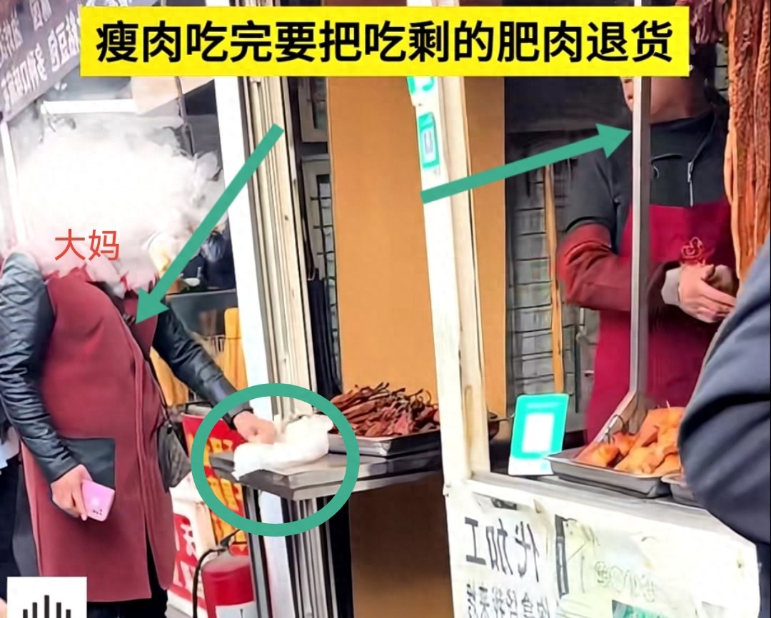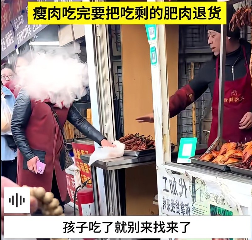 老板此时气不一打一处来,向大妈怒吼道:“我开店多年,遇人无数,还是第一次遇到你这种无理取闹的人。哪有这么干的啊,廋肉吃完了把肥的拿回来找我退货?”