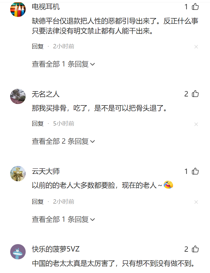 有网友说,孩子吃的,孩子也没让你退钱阿?老人家,自己办的磕碜事,拉自己家的孩子当挡箭牌,你孩子吃的,你找你孩子要钱去。