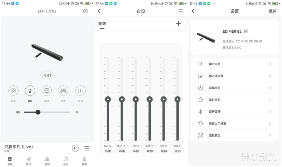 并且,漫步者B2电视音响还能通过专属APP,解锁更多技能。提供有电影、音乐、新闻、游戏等预设音效模式,能适配不同风格的音乐,还能通过均衡器进行自定义音效,根据自己的喜好风格进行设置,可玩性比较强。