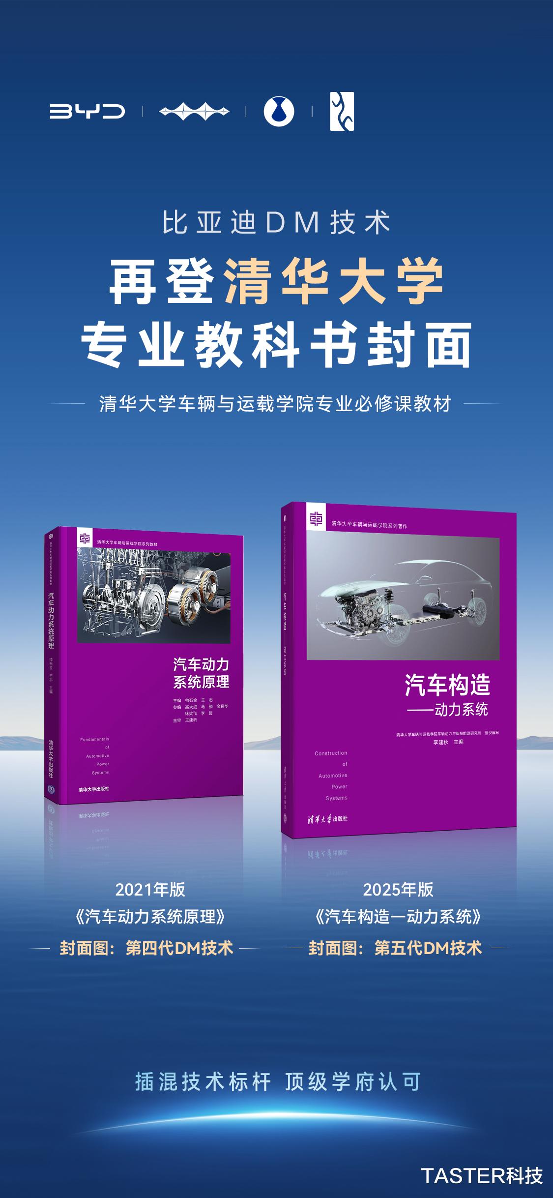 比亚迪DM技术凭借在插混领域的开创性实力和行业标杆地位,先后两次编入清华大学汽车专业教材并登上封面——2021年版《汽车动力系统原理》、2025年版《汽车构造—动力系统》,成为高校汽车专业教学的重要参考案例。