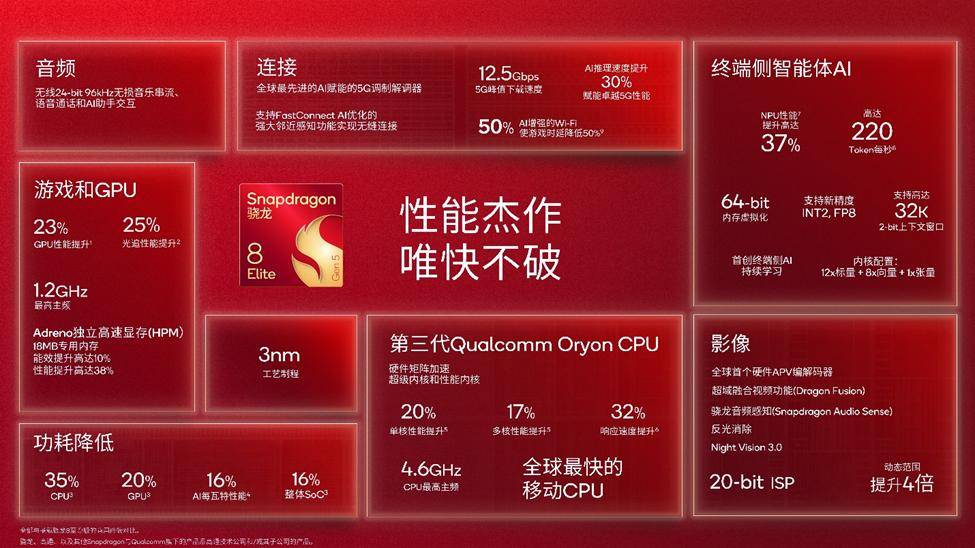 整体看来,第五代骁龙8至尊版是一次常规升级。由于高通在上一代骁龙8至尊版上放弃ARM公版方案,改采用自研Oryon CPU的两个“超大核”加上六个“性能核”的架构。所以,本次高通的升级思路基本以巩固设计路线和提升参数为主,尤其是CPU性能的跃升。