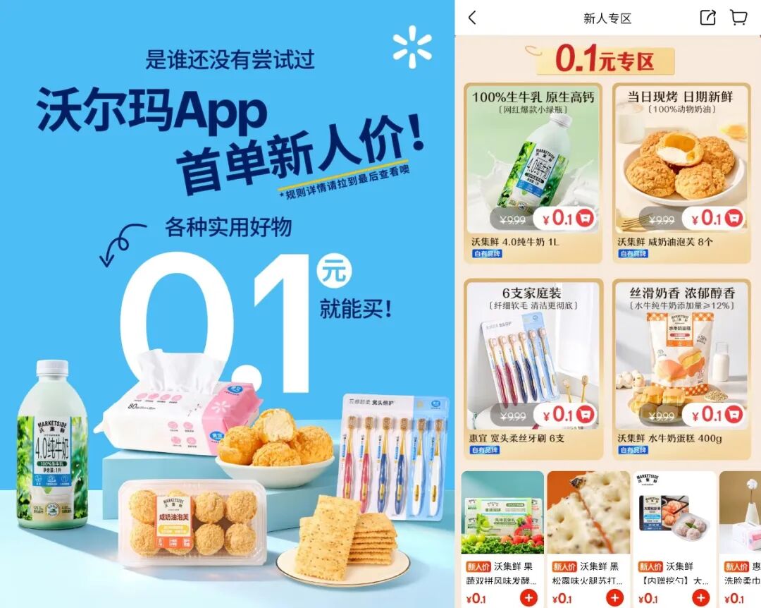 作为新用户,我下载、注册沃尔玛App之后,最先走进的是主页最醒目的“新人专区”。在这里,我下单一瓶1L小绿瓶纯牛奶,就只花了0.1元!产品日期很新鲜,就是喝得太快,我没能给它留下一张人生大片。