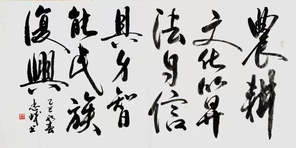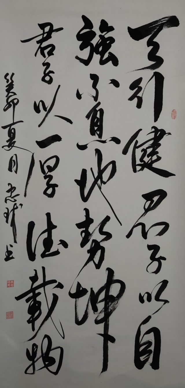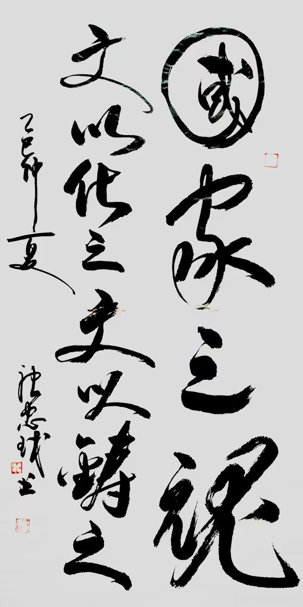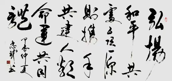 在艺术理念上,唐忠球更是展现出卓越的才华。他将科研理性思维融入书法结构章法,实现了书法与公共艺术、国际交流的有机结合,以书载道、彰显时代精神。他的创作始终以文化根脉为坚实基石,以时代精神为灵动笔锋,于笔墨纵横间搭建起传统与现代深度对话的艺术场域。