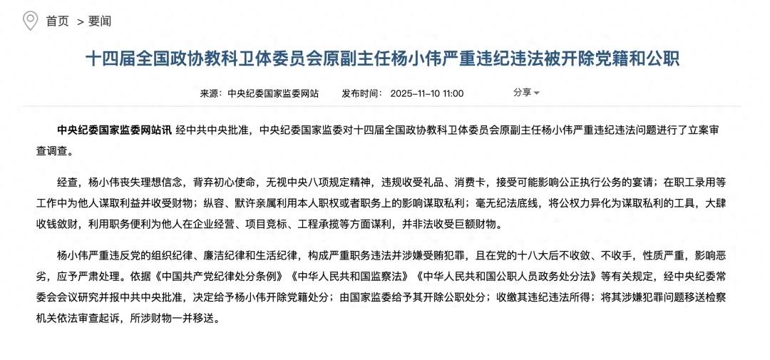 经中共中央批准,中央纪委国家监委对十四届全国政协教科卫体委员会原副主任杨小伟严重违纪违法问题进行了立案审查调查。