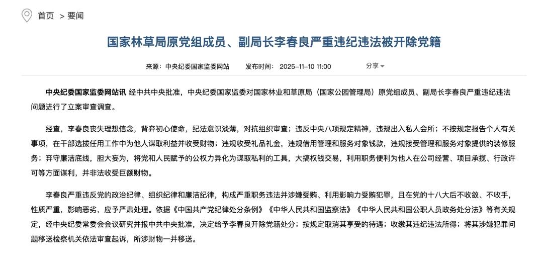 经中共中央批准,中央纪委国家监委对国家林业和草原局(国家公园管理局)原党组成员、副局长李春良严重违纪违法问题进行了立案审查调查。