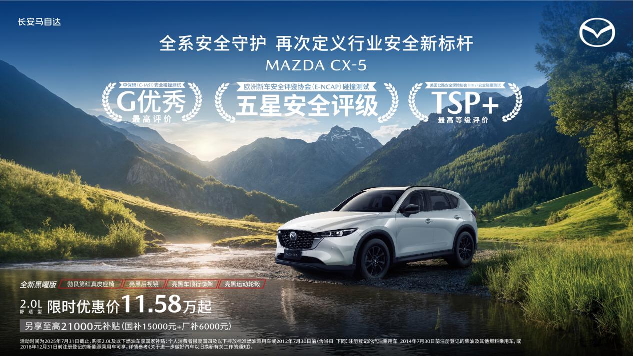MAZDA CX-5 黑曜版的 “黑化美学” 早已圈粉无数,充满速度感的黑化涂装和激情满满的内饰,光是看着就让人想踩下油门。作为一款经典畅销车,它的实力藏在细节里:不用加装颗粒捕捉器就能满足国六 B 排放标准,省心又省事。安全方面更是履历亮眼,连续 9 年拿北美 IIHS“TSP+”,中国 C-NCAP、欧洲 E-NCAP 等全球权威认证一个不落,还连续 5 年获日本 “儿童保护设计大奖”,对家庭用户来说格外贴心。7 月活动中,11.58 万起的价格之外,符合条件的用户置换还能享至高 6000 元厂补和 15000 元国补,性价比又升了一档。