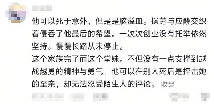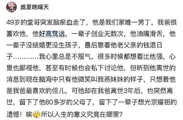 “好高骛远,一事无成”—— 49 岁堂哥的死讯冲上热搜,简简单单八个字概况了他短短的一生。他的死讯忽然跃上热搜,那些努力的深夜、未圆的梦,都被这简单的八个字收了尾。亲戚们的指责里藏着恨铁不成钢的叹惋,可最后留在时光里的,终究只是这八个冰冷的概括。