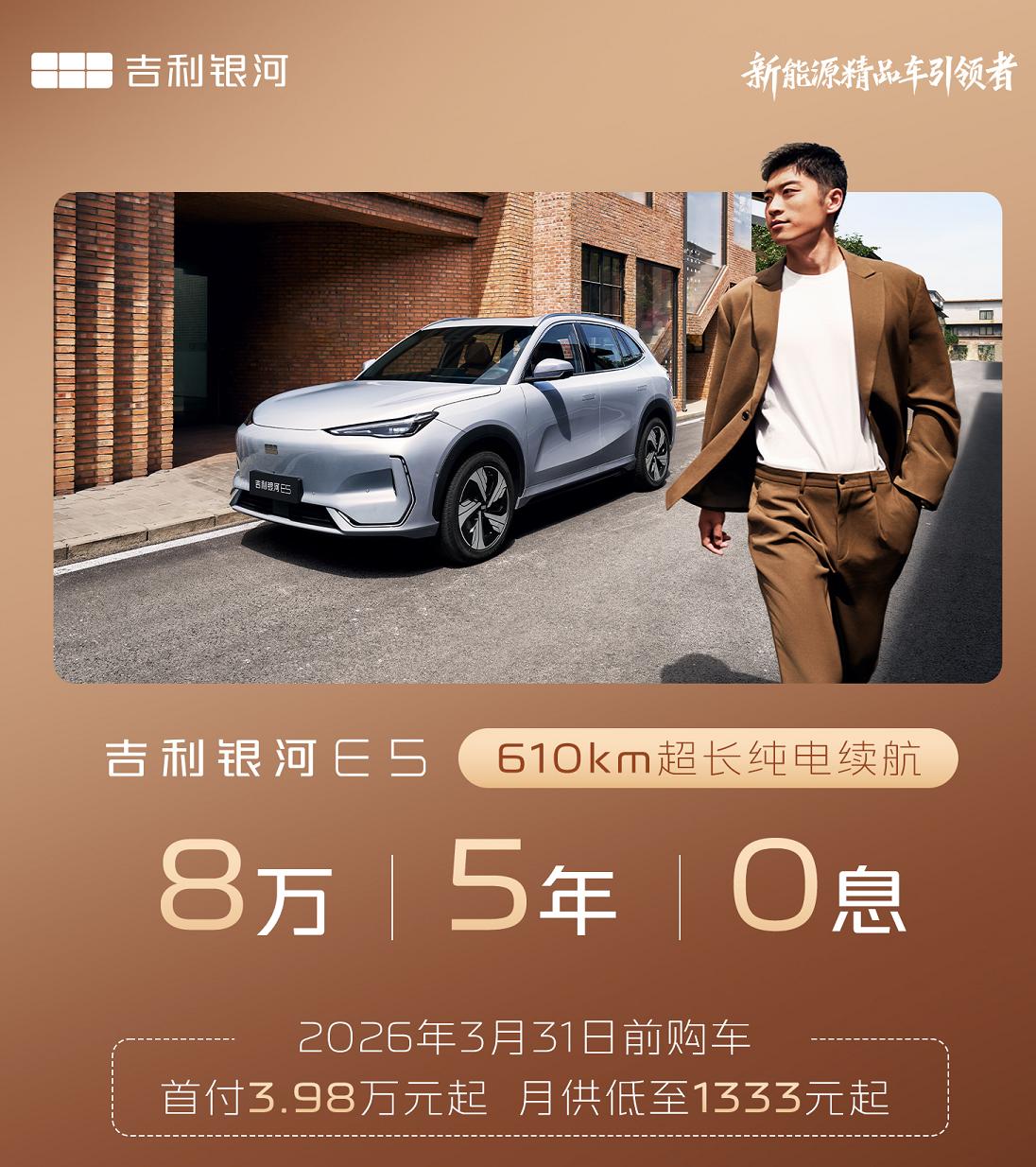 好消息!现在购买吉利银河E5 2026款610km车型,可享限时金融礼遇:8万元5年0息,首付仅需3.98万起,月供低至1333元。活动截至2026年3月31日,轻松开启超长纯电出行体验。