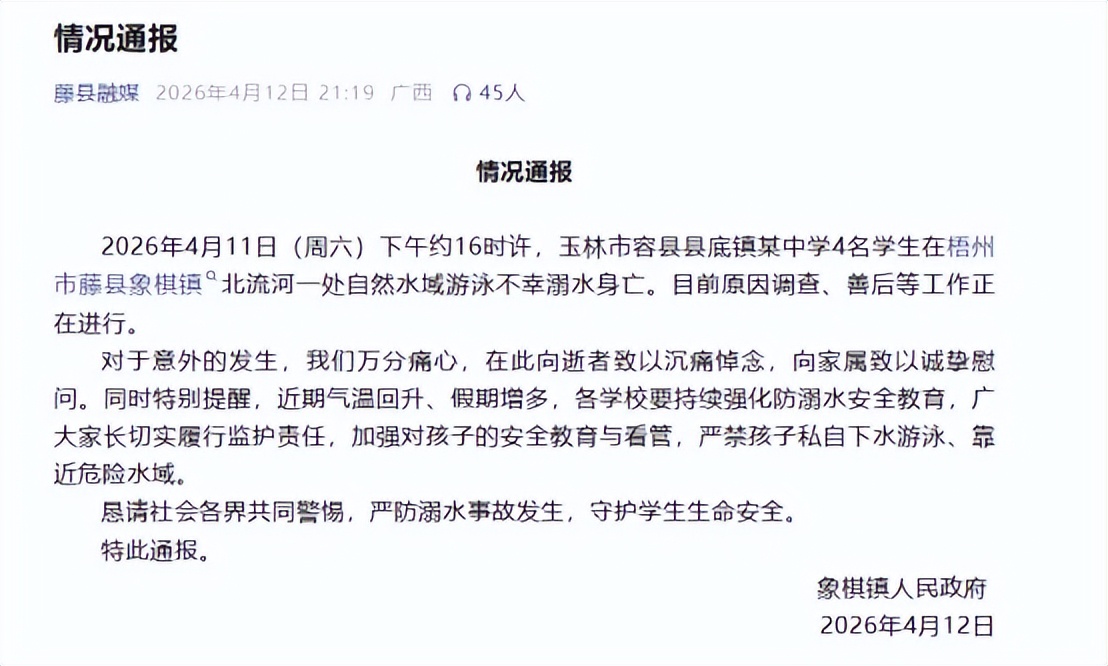 据广西梧州市藤县象棋镇人民政府通报,4月11日约16时许,玉林市容县县底镇某中学4名学生,在象棋镇北流河一处自然水域游泳,不幸溺水身亡。