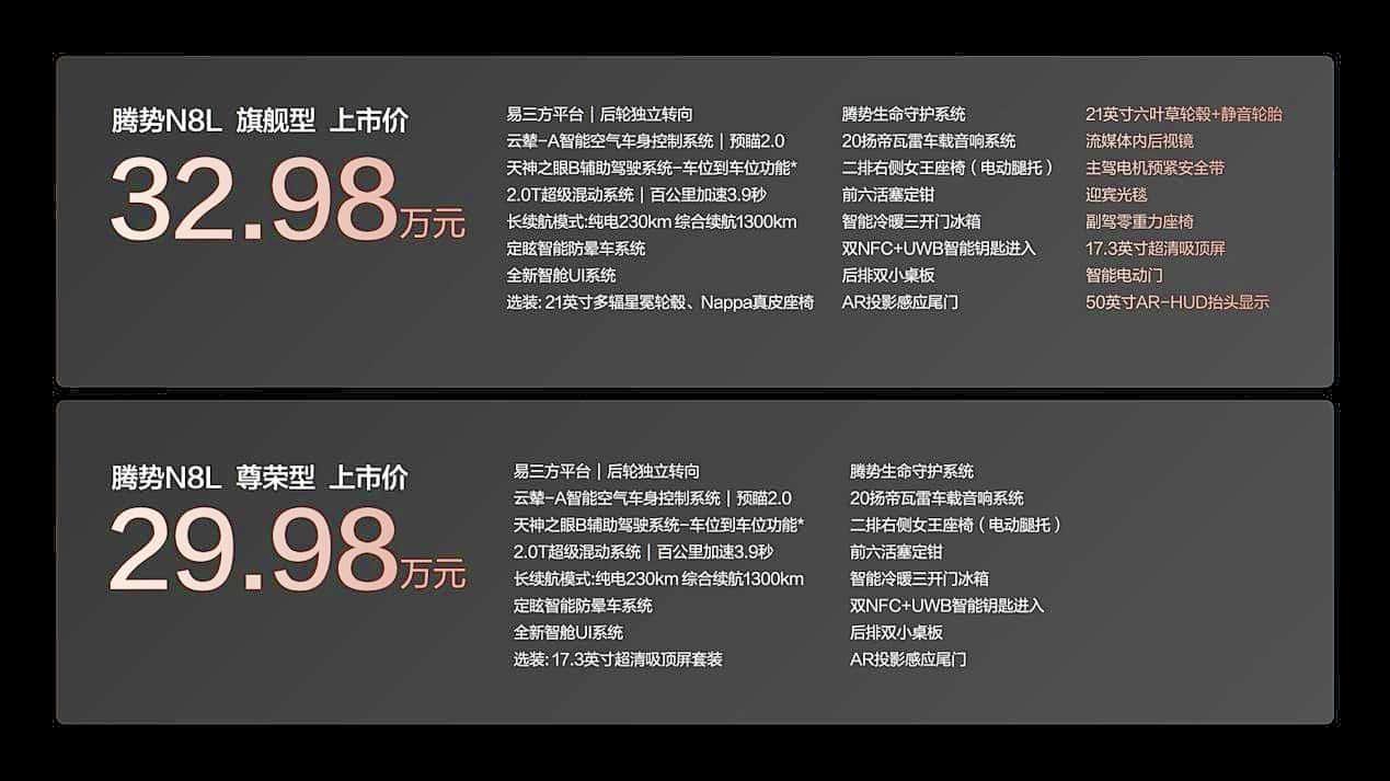 10月28日,“大六座安全豪华SUV”腾势N8L正式上市,共推出2款车型,官方指导价为29.98万元~32.98万元!越级价值终极满足,N8L全系标配“六大核心科技”,以超越传统豪华的品质标准,诠释家用车的豪华感、安全感与科技感,创造让全家人动心、舒心、省心、安心、暖心的出行体验,以“五心体验 三感相伴”,定义美好出行。
