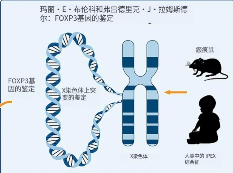 2001 年 —— 玛丽·布伦科 / 弗雷德·拉姆斯德尔:锁定 FOXP3 基因与严重自身免疫表型的因果关联;在人类中,FOXP3 变异导致罕见而致命的 IPEX 综合征。