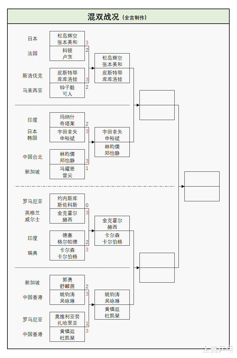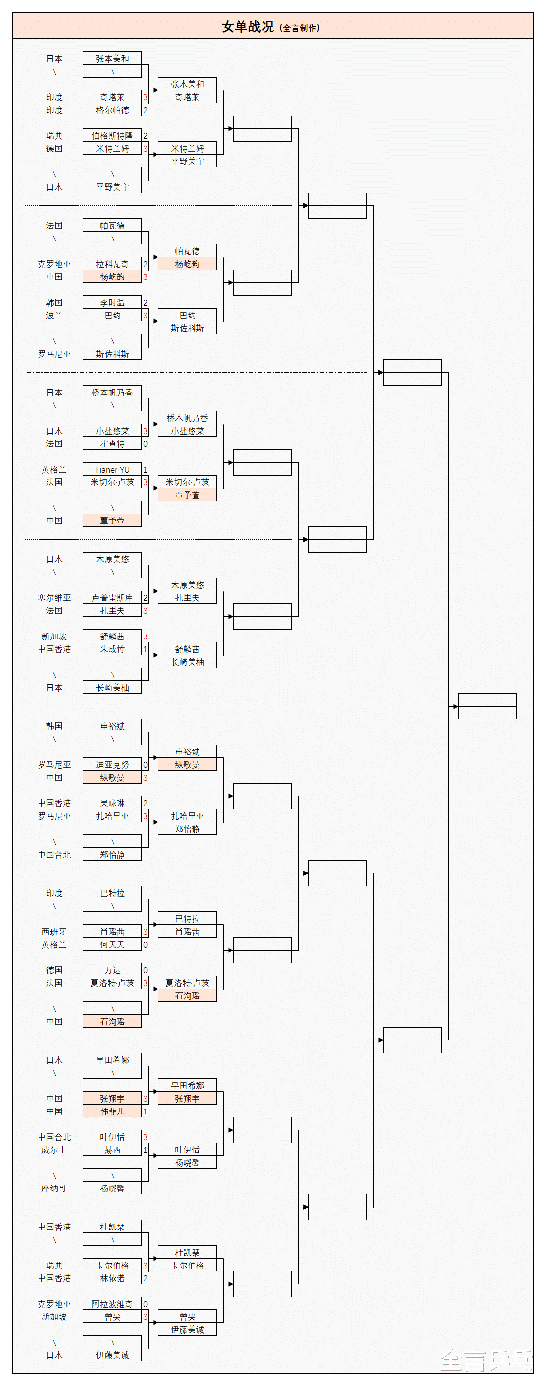 女双:覃予萱/纵歌曼3-1韩菲儿/杨屹韵、石洵瑶/张翔宇3-0郑爱欣/可人(马来西亚)。