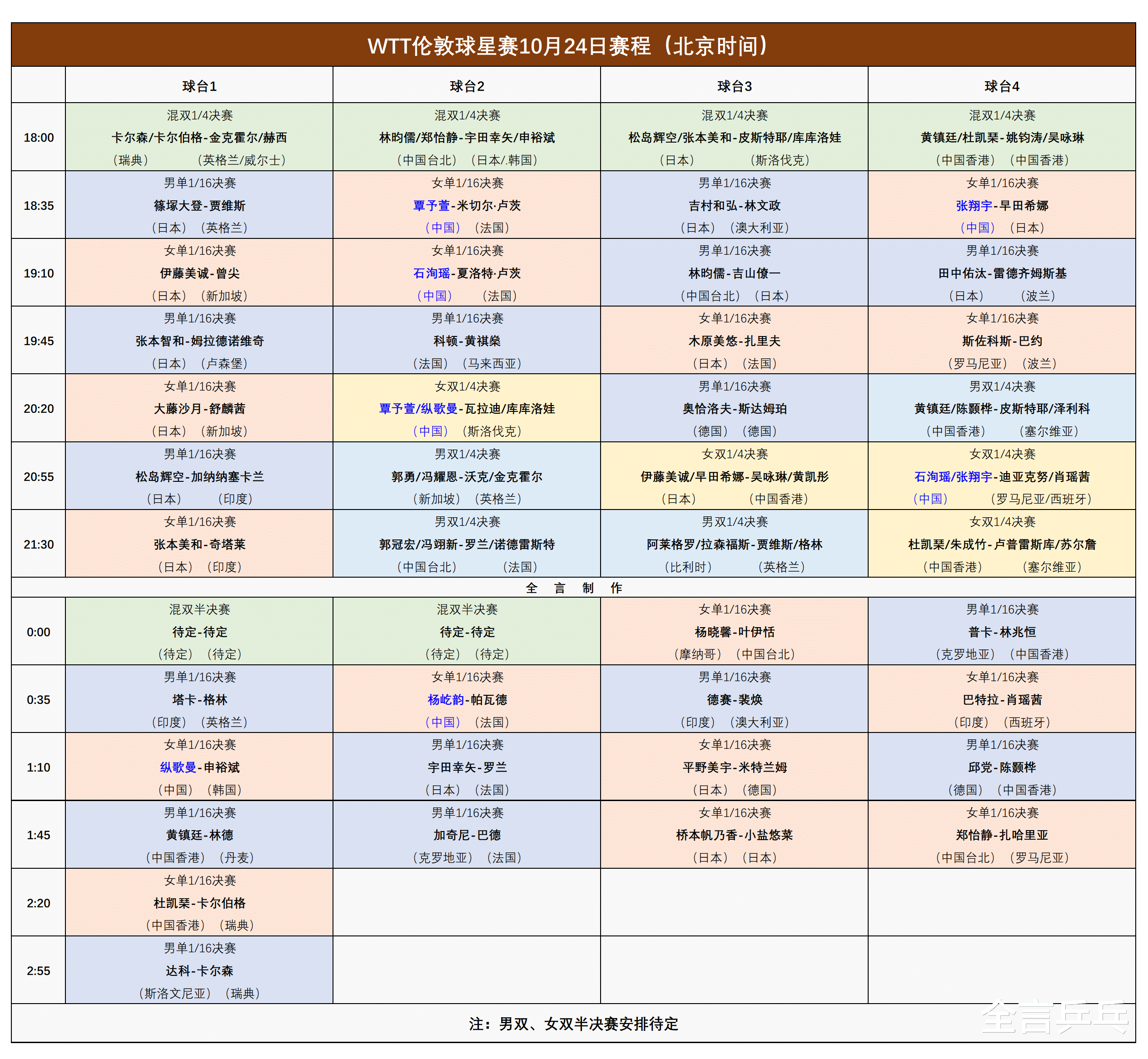 根据安排,10月24日开始两项单打首轮轮空的前16号种子都将登场参加1/16决赛,其中就包括国乒运动员石洵瑶、覃予萱,以及外协会名将张本智和、张本美和等人;至于三项双打则会先后进行1/4决赛与半决赛,其中国乒已经确定的赛程包括: