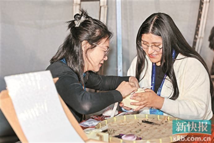 外国嘉宾制作艾草手工艺品。 新快报记者邓迪/摄