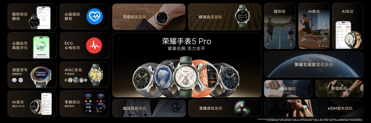 荣耀手表5 Pro以挑战极境为灵感,致敬人类突破自我、探索未知的精神,传承经典设计中的极致工艺,结合腕表中的经典美学,展现出极致美感与当代科技相互融合的独特魅力。新品共有eSIM和蓝牙两个版本五种配色可选,其中探秘家打破传统智能手表材质边界的同时,创新融合真金镀层表圈与纳米微晶陶瓷内圈双材质,在光影交错间呈现出细腻的质感层次与轻奢光泽,时尚又不失优雅。