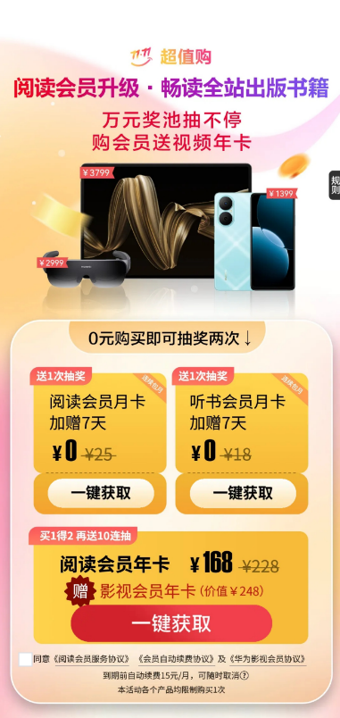 这波灵感,来自我升级了鸿蒙5的华为Pura 80,我发现华为阅读的双11活动相当划算,现在入手阅读年卡,竟然直接加赠一张华为视频的年卡。等于花一份钱,同时承包了我未来一整年的阅读和观影KPI,这可比囤日用品有意思多了!